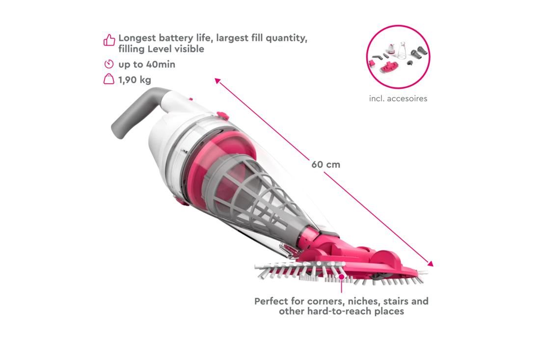 Zwembadstofzuiger, oplader, 2 filterinzetstukken en hoekborstel met 2 jaar garantie.