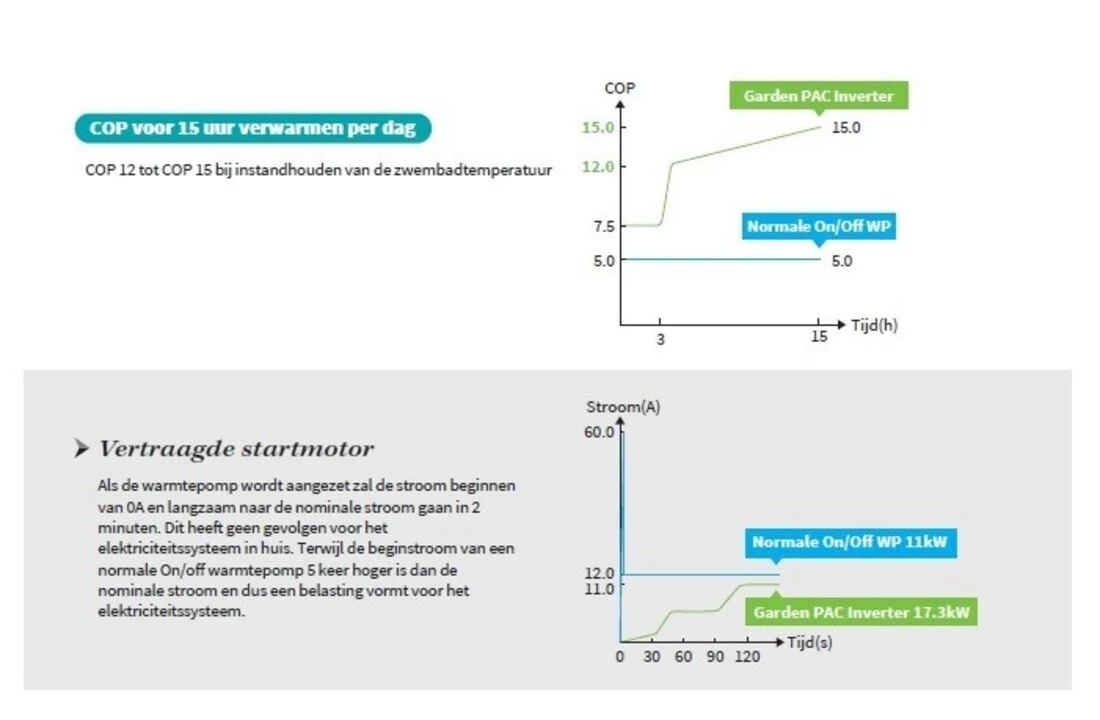 Als de warmtepomp wordt aangezet zal de stroom beginnen van 0A en langzaam naar de nominale stroom gaan in 2 minuten. Dit heeft geen gevolgen voor het elektriciteitssysteem in huis. Terwijl de beginstroom van een normale On/off warmtepomp 5 keer hoger is dan de nominale stroom en dus een belasting vormt voor het elektriciteitssysteem.