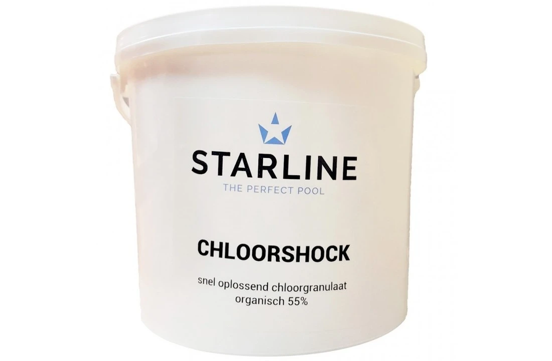 Starline chloorshock, ook wel chloorgranulaat genoemd, wordt geleverd in poedervorm, in een verpakking die goed af te sluiten. De chloorshock bevat 55% chloor, waardoor het juiste chloorgehalte snel bereikt kan worden om het water vervolgens continu te desinfecteren tegen bacteriën en algen. Doordat het chloorgranulaat gestabiliseerd is vervliegt deze minder snel door de invloed van UV-straling door de zon.